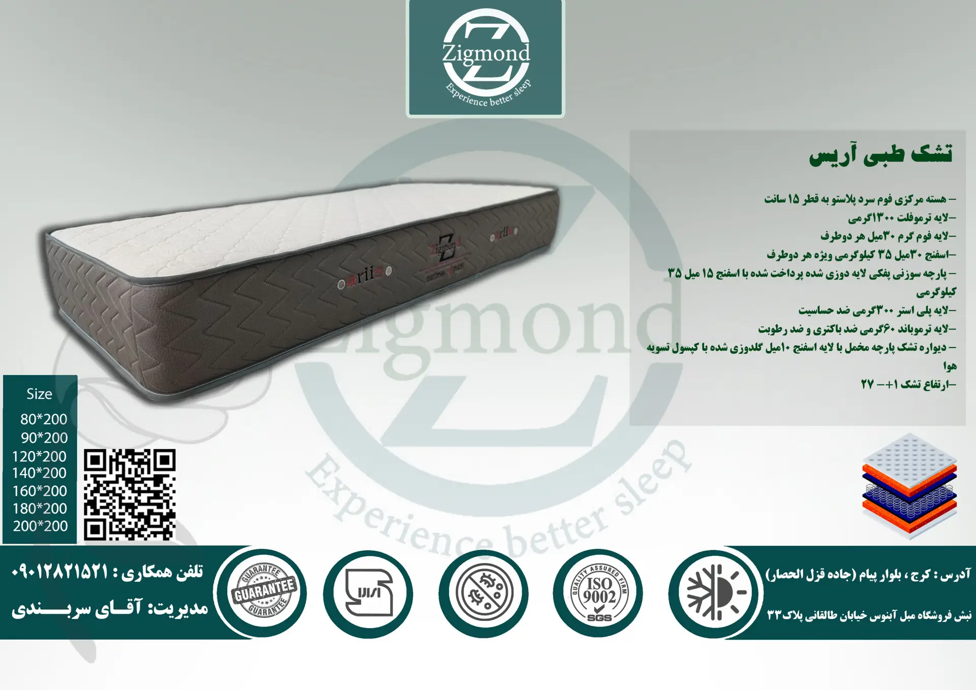 تشک آریس محصولی از برند تولیدی تشک زیگموند، با استفاده از هستهی فوم سرد باکیفیت و ترکیبی از فوم گرم و اسفنج ویژه، برای کسانی طراحی شده که به دنبال خواب طبی عمیق، بدون فشار، با دوام بالا هستند. طراحی اصولی این تشک به شما کمک میکند ستون فقراتتان در وضعیت صحیح قرار بگیرد و از حس بیقراری در طول خواب جلوگیری شود.