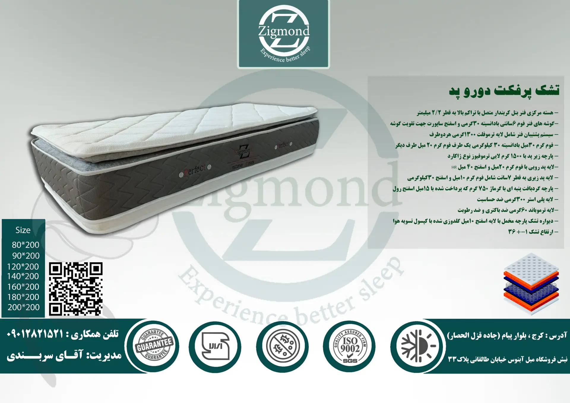 تشک پرفکت دورو پد از سری محصولات خاص برند تولیدی تشک زیگموند با ساختاری حرفهای و پدهای طبی در دو طرف، برای کسانی طراحی شده که دنبال راحتی عالی در کنار پشتیبانی استاندارد از بدن هستند. با ترکیب دقیق فنر بنل کربندار، اسفنجهای تراکم بالا و دو پد مجزا، این مدل گزینهای لوکس و کاربردی برای خواب عمیق و سالم است.