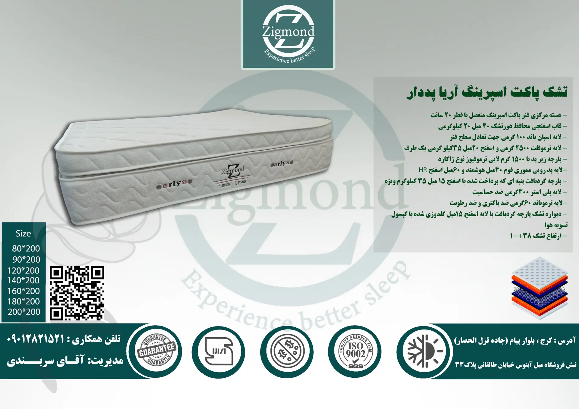 تشک آریا پددار با ساختار پیشرفتهی فنر پاکتی منفصل، پد مموری هوشمند و لایهبندی چندگانه طراحی شده تا پاسخگوی بالاترین انتظارات از یک تشک لوکس و مدرن باشد. طراحی دقیق این مدل باعث حذف کامل انتقال حرکت، تهویه عالی، و پشتیبانی هدفمند از بدن در هنگام خواب میشود.
